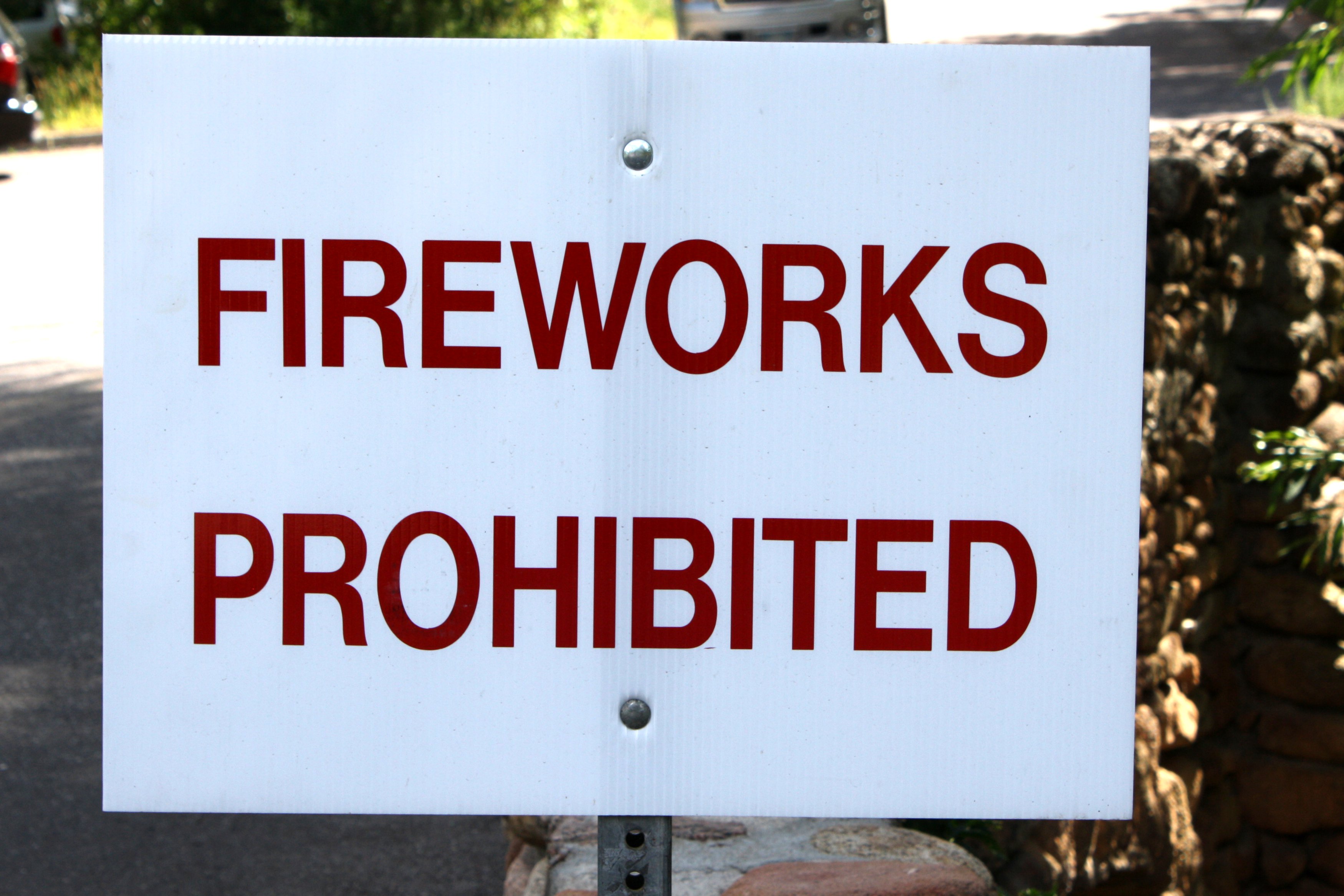 Free high resolution photo of a sign reading Fireworks Prohibited. This photo was taken on July 4th, unfortunately, there was a fire just a few miles up the road from this site. Someone obviously did not follow the fireworks ban! Free picture for any use.