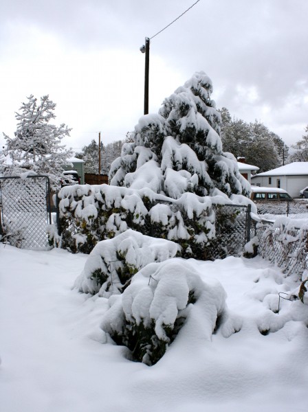 Free high resolution photo of a back yard garden covered with snow from an early fall storm. There is about 8 inches of snow covering the tomato plants and you can see a pine tree and snow covered grape vines in the background. Free picture for any use.